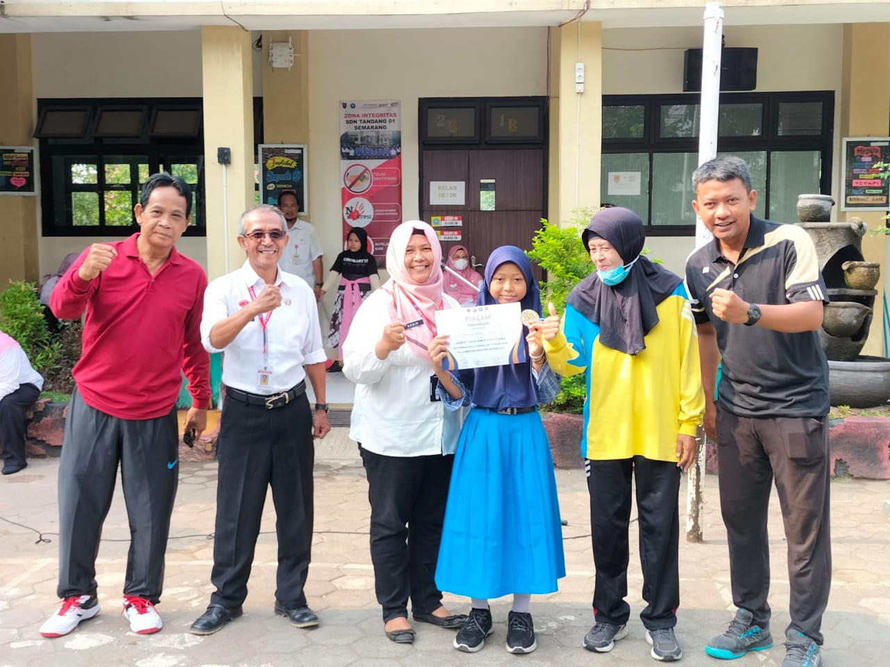 Penyerahan tropi dan piagam penghargaan kepada Maulida Casimira Putri oleh Kepala SDN Tandang 01 (Bapak Tri Setyo Budi, S.Pd) karena telah meraih Juara I Usia Dini Putri Utama dalam Kejuaraan Bulu Tangkis Setyo Budi Cup Piala Rektor USM dan PWI Jateng 2023